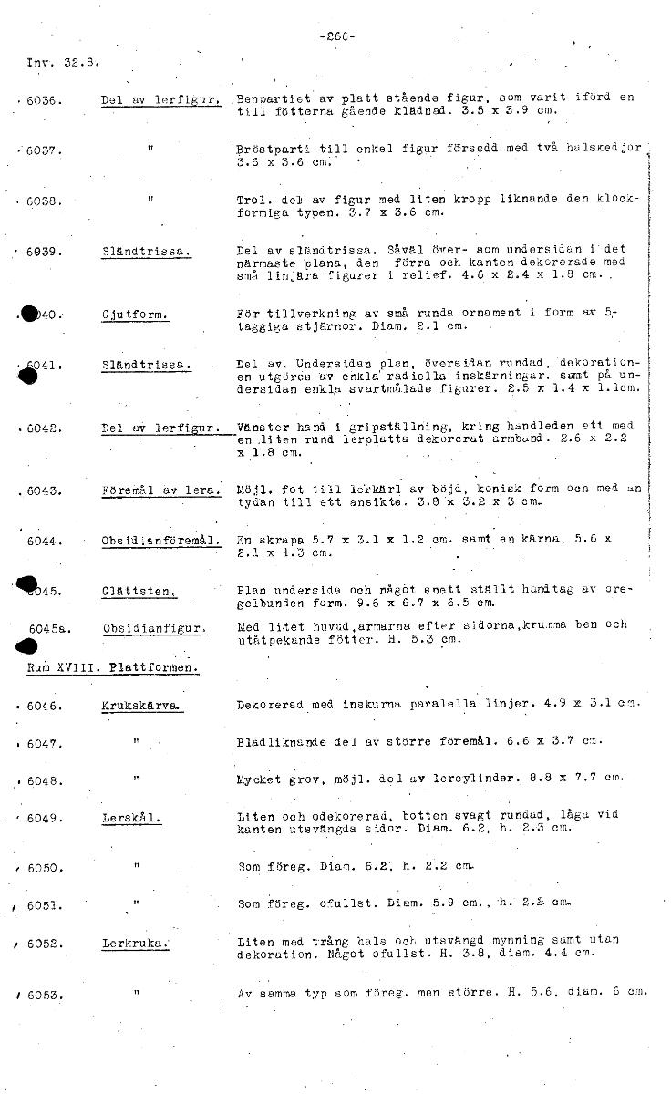 -266- Inv. 32.8. • 6036. Del av lerfigur. .Benpartiet av platt stående figur, som varit iförd en till fötterna gående klädnad. 3.5 x 3.9 cm. • 6037. TT Bröstparti till enkel figur försedd med två hals...