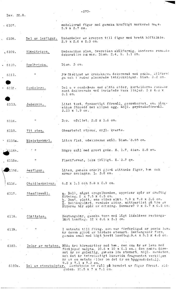 -270- Inv. 32.8. 6107. modellerad figur med ganska kraftigt markerad ma .e. 5.9 x 3.7 cm. 6108. Del av ler-figur. Underdelen av kroppen till figur med brett höftkläde. 2.9 x 2.6 x 2.3 cm. k6109. Sländtrissa. Undersidan plan, översidan skålformig, kanterna runuade dekoration sdcnas. Diam. 2.4, h. 1.1 cm. 6110. Spelbricka. Diam. 3 cm. 6111. Fdrfärdiad av krukskärva dekorerad med enkla, kilvorml gsa och i rader placerade intryckningar. Diam. 3.2 cm. 010) - 6112. Candelero. Del a v candekero med släta sidor, kortsidorna rundade samt dekorerade med inristade raka linjer. 5 x 4.5 x 3.1 cm. 6113. Jadekniv, Litet tunt, fyrkantigt föremål, genomborrat, ena lån- sidan försedd med slipad egg. Möjl. prydnadsföremål. 2.25 x 1.9 cm. 6114. D:o. ofullst. 2.2 x 1.6 cm. 6115. Vit sten. Obearbetat stycke, möjl. kvarts. 6115a. Miniatyrkärl. Liten flat, odekorerad skål. Diam.'3.85 415b. Högre skål med grovt gods. H. 1.7, diam. 2.8 cm. 6115c. Flaskformat, icke ihåligt. H. 3.7 cm. 49115d. lerfigur. Liten, ganska enkelt gjord sittande figur, ben och armar avslagna. L. 3.8 cm. 6116. Obsidianknivar. 6.2 x 1.1 och 5.8 x 0.9 cm. 6117. Stenföremål. a. Boll, något oregelbunden, uppvisar spår av kraftig sötning. 8 x 7.5 x 6.5 cm. b:Runt, platt; ena sidan slät. 7.9 x 7.8 x 3.6 cm. U. Rektangulärt, rundade sidor, mittpartiet på tre av Uidorna bär spår av nötning. Hammare? 9 x 6.7 x 6.2 cm. 6118. Clättsten. Rektangulär, ganska tunn med lågt liialdees rektangu- lärt handtag. 12 x 8.6, x 5.1 cm. 6119. I motsats till föreg. son var förfärdigad av porös lava är denna gjord av hårdare stenart. Rektangulär form, ganska smal med högt brett handtag.9.4 x 5.1 x 4.6 cm. 6120. Delar av metates. Båda äro hörnpartier med ben, den ena är av lava med fördjupad malyta, 10.6 x 10 x 6.1 cm.; den andra däre- mot är av gulaktig, gal ska lös stenart, möjl. sandsten, och det är tvivelaktigt huruvida fragmentet verkligen är av en metate eller om det är en byggnad,-7deta1j. 9.3 x 7.1 x 7.3 cm. 6120a. Del av stenskulptur. Uantstycke av skål på huvudet av figur färest. eld- guden. 10.5 x 7 x 7.1 cm. [ocr]