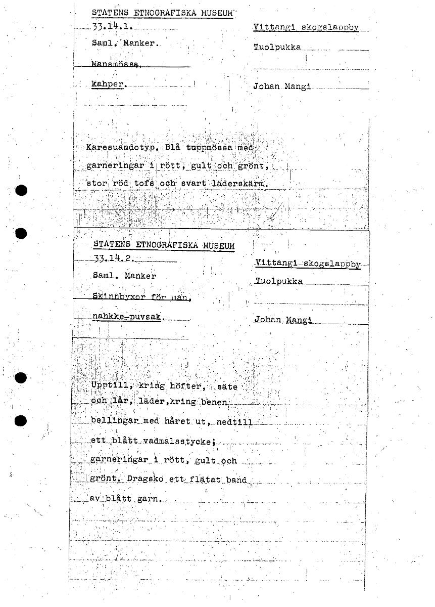• STATENS ETNOGRAFISKA MUSEUM' . • ittangi skogslapnby_ Sanal '..Manker. • MänsM6s kahper. Johan Mangi_ _ -i:garneringar. d rött ; och:: gront _ stor'röd; tOi'' och svart STATENS ETNOGRAFISKA MUSEUM i •... Visa hela