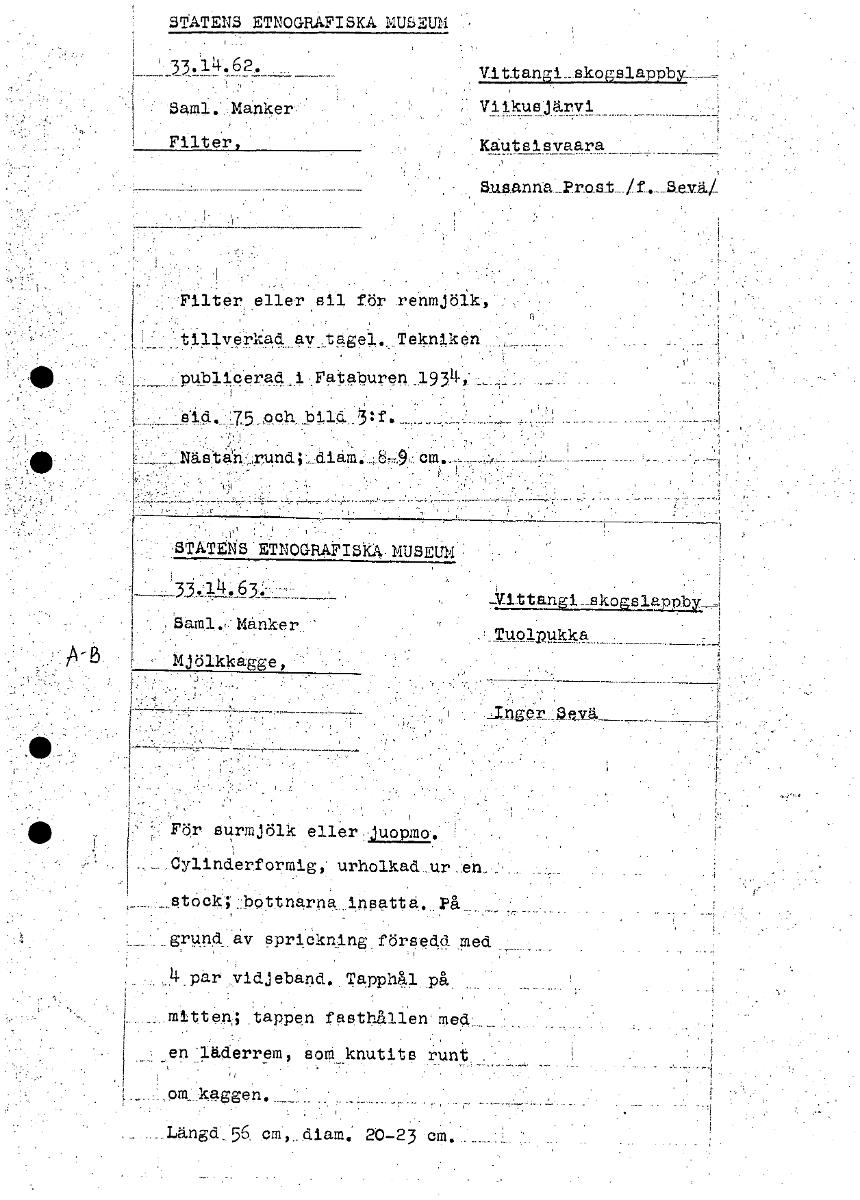 STATENS ETNOGRAFISKA MUSEUM 33.14.6?.. Vittangi_skogslappby', Saml. Manker Viikusjärvi Filter, 'Kautsisvaara Susanna Prast_./f..._SevIk __LP1414iPeradA.FgAburen_1934;._,_ si d. 7.5,9qh,11A.L5:f._ ',STAUNS'ETNOGRAPISKA.MUSEUM: _iittangi_skogslappby_i Samt Manker .,.- Tuolpukka -; MjöIkkagge e Lä För surmjölk eller,>opmo. .0ylinderformig,' urholkad_ur.en...: AtOck;' bottnArng ITIPatte..14_ _grund:av sprickning.försed med 4.par ,vidjeband. Tapphål på mitten:; .tappen fasthållen' Med:.. en läderrem, som knutits runt Längd:56. C diam. 20-23 cm. [ocr]
