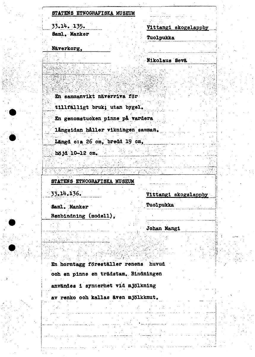 STATENS ETNOGRAFISKA MUSEUM Vittangi skogslappby_ Manker Saml, Tuolpukka Nikolaus'Sevä sammanvikt näverriva för tillfälligt brukvutan bygel, 211 genomstucken pinne på vardera långsidan håller vikningensamman, d csa 26 oM .bredd 19 i0-12 om, STATENS ETNOGRAFISKA MUSEUM 3394436._ Vittangi skogslappby Sam1.14inker Tuolpukka Renbindning (modell), Johan Mangi En horntagg föreställer renens huvud och en pinne en trädstam. Bindningen användes i synnerhet vid mjölkning av renko och kallas även mjölkknut. [ocr]Stäng