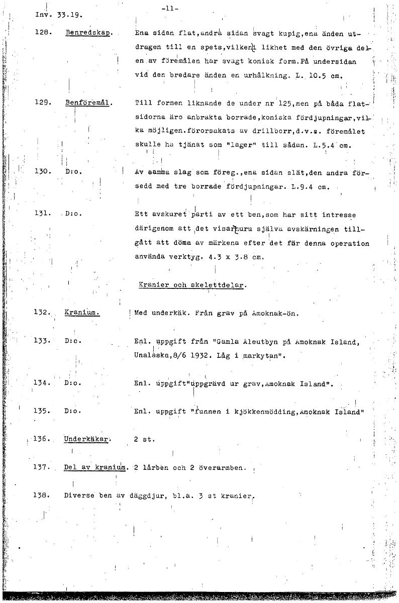1 Inv. 33.19. 128. Benredskap. Ena sidan flat,andrå sidan 'svagt kupig,ena änden ut- dragen till en spets,vilkenti likhet med den övriga del-. en.av föremålen har svagt konisk form.På undersidan vid den bredare änden en urhålkning. L. 10.5 cm. 129. Benföremål. Till formen liknande de under nr 125,men på båda flat' sidorna äro anbrakta borrade,koniska fördjupningar,vil-' ka möjligen.förorsakats av drillborr,d.v.s. föremålet skulle ha tjänat som "lager" till sådan. L.5.4'cm. il 130. D:o. Av samma slag som föreg.,ena sidan slät,den andra för- Sedd med tre borrade fördjupningar. L.9.4 cm. 131. .D:o. Ett avskuret Parti av ett ben,som har sitt intresse därigenom att Idet visar uru själva avskärningen till- gått att döma av märkena efter det fär denna operation använda verktyg. 4.3 x 3.8 cm. Kranier och skelettdelar. 132. Kranium. ! Med underkäk. Från grav på Amoknak-ön. 133. D:o. Enl. uppgift från "Gamla Aleutbyn på Amoknak Island, i . Unalåska,8/6 1932. Låg i markytan". i • D:o. Enl. Uppgift"Uppgrävd ur grav,Amoknak D:o. 'Enl. uppgift "funnen i kjökkenmödding,Amoknak Island" Underkäkar. 2 st. 1 137. Del av kranium. '2 lårben och 2 överarmben. Iii • i 138. Diverse ben av däggdjur, bl.a. 3 st kraniers. [ocr]