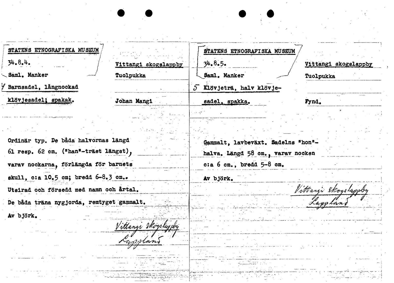 i STATENS ETNOGRAFISKA MUSEUM/ *ATENS ETNOGRAFISKA MUSEUM 1' I 34.8.4. • Vittangi.skogslamby 8.5. Vittangi skogslappby Manker Tuolpukka Ljaml. Manker Tuolpukka Barnsadel, långnockad Klövjeträ halv klö...