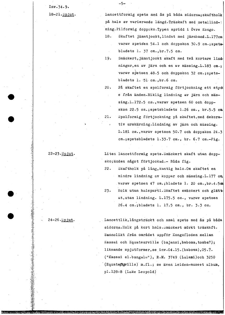 -5- Inv.34.9. 18-21.spjut. Lancetiformig spets med ås på båda sidorna;skaftholk på hals av varierande längd.Träskaft med metallind-', ning.Pilformig doPpsko.Typen spridd i övre Kongo. 18. Skaftet jämn...