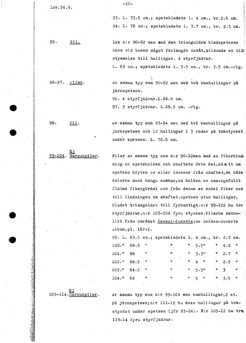 Inv.34.9. 93. L. 73.5 cm.; spetsbladets 1. 4 cm., br.2.5 cm. 94. L. 76 cm.; spetsbladets 1. 3.7 cm., br. 2.3 cm. 95. Pil. Lik n:r 90-92 men med den triangulära bladspetsens hörn vid basen. något förlä...