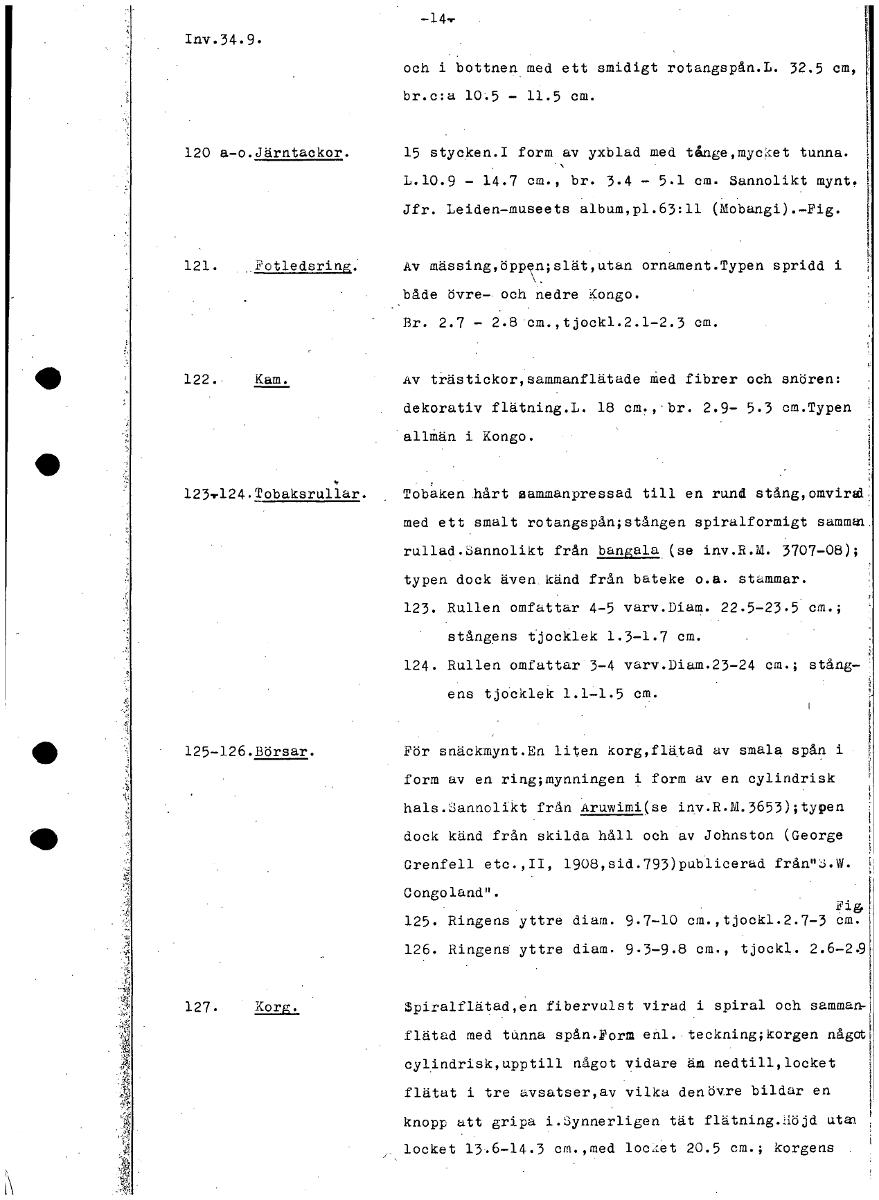 Inv.34.9. och i bottnen med ett smidigt rotangspån.L. 32.5 cm, br.c:a 10.5 - 11.5 cm. 120 a-o.Jårntackor. 15 stycken.I form av yxblad med tånge,mycket tunna. L.10.9 - 14.7 cm., br. 3.4 - 5.1 cm. Sannolikt mynt. Jfr. Leiden-museets album,p1.63:11 (Mobangi).-Fig. 121. .Fotledsring. Av mässing,öppen;slät,utan ornament.Typen spridd i både övre--och nedre Kongo. Er. 2.7 - 2.8 cm.,tjock1.2.1-2.3 cm. 122. Kam. trästickor,sammanflätade Med fibrer och snören: dekorativ flätning.L. 18 cm.,•br. 2.9- 5.3 cm.Typen allmän i Kongo. 123w124.Tobaksrullar. Tobaken hårt sammanpressad till en rund stång,omvirtd: med ett smalt rotangspån;stången spiralformigt sammeu rullad.bannolikt från bangala (se inv.R.M. 3707-08); typen dock även känd från bateke o.a. stammar. 123. Rullen omfattar 4-5 varv.Diam. 22.5-23.5 cm.; stångens tjocklek 1.3-1.7 cm. 124. Rullen omfattar 3-4 varv.Diam.23-24 cm.; stång- ens tjocklek 1.1-1.5 cm. 125-126.Börsar. För snäckmynt.En liten korg,flätad av smala spån i form av en ring;mynningen i form av en cylindrisk hals.Sannolikt från Aruwimi(se inv.R.M.3653);typen dock känd från skilda håll och av Johnston (George Grenfell etc.,II, 1908,sid.793)publicerad från"S.W. Congoland". iig. 125. Ringens yttre diam. 9.7-10 cm.,tjockl.2.7-3 cm. 126. Ringens yttre diam. 9.3-9.8 cm., tjockl. 127. Korg., Spiralflätad,en fibervulst virad i spiral och samman- flätad med tunna spån.Form enl. teckning;korgen något cylindrisk,upptill något vidare ära nedtill,locket flätat i tre avsatser,av vilka denövre bildar en knopp att gripa i.Synnerligen tät flätning.Höjd locket 13.6-14.3 cm.,med locket 20.5 cm.; korgens . [ocr]