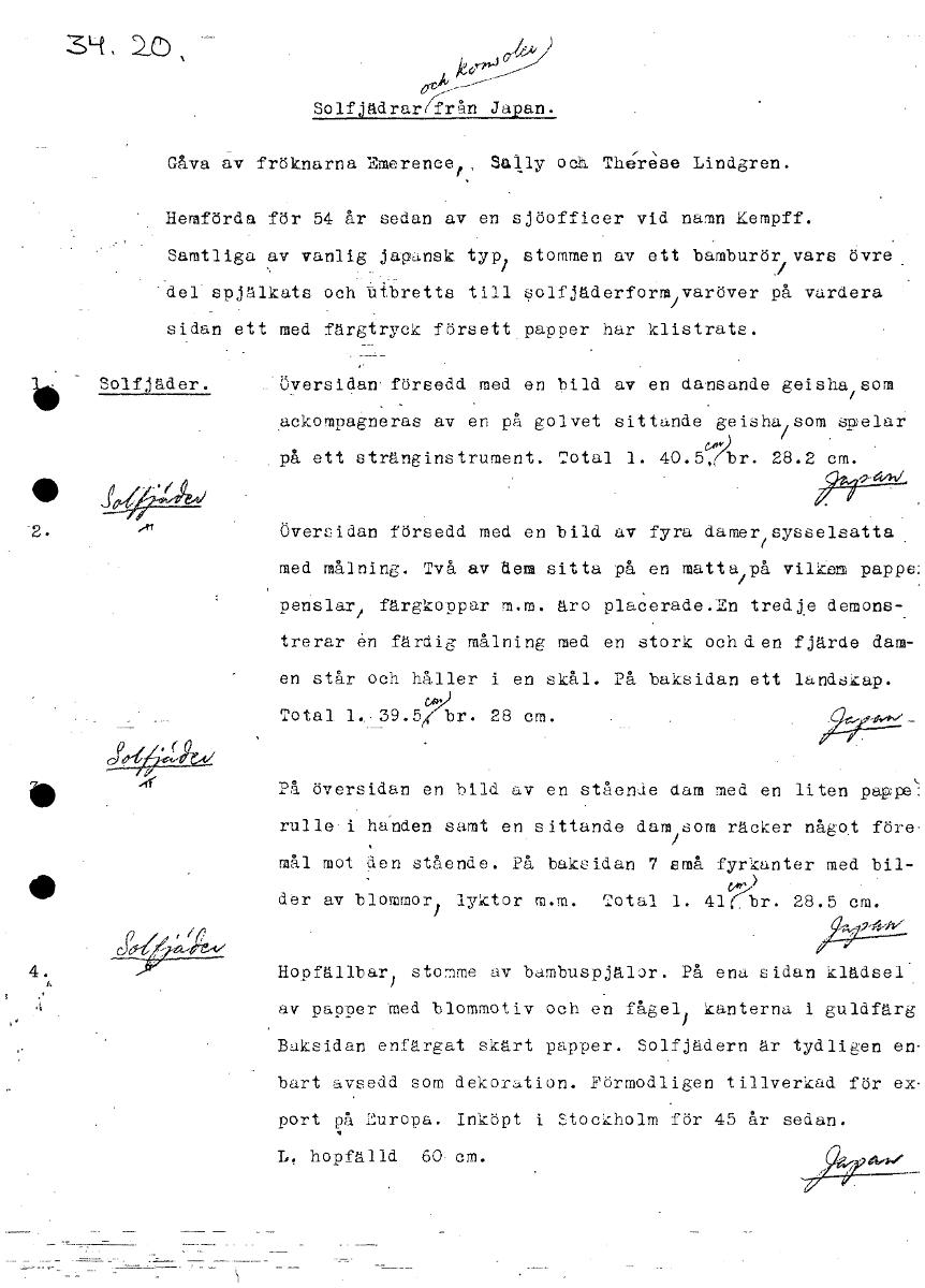 34. 1CD , 14 i Solfjädrar/från Japan. Gåva av fröknarna Emerencet' Sal ly och Therese , Lindgren. Hemförda för 54 år sedan av en sjöofficer vid namn rempff. Samtliga av vanlig japansk typ1 stommen av ett bamburör J vars övre del spjälkats och Utbretts till solfjäderform/varöver på vardera sidan ett med färgtryck försett papper har klistrats. Solfjäder. aÖversidan• försedd med en bild av en dansande geisha som ackompagneras av en på golvet sittande geisha som 'spelar . på ett stränginstrument. Total 1. 40.57br. 28.2 cm. Översidan försedd med en bild av fyra damerisysseleatta med målning. Två av /lem sitta på en matta på vilken papps: penslar / färgkoppar m.m. äro placerade.En tredje demons- trerar en färdig målning med en stork och den fjärde dam- en står och håller i en skål. På baksidan ett landskap. Total 1. 39.5 br. 28 cm. • På översidan en bild av en stående dam med en liten papple rulle .i handen samt en sittande dam/som räcker något före- mål mot den stående. På baksidan 7 små fyrkanter med bil- der av blommor/ lyktor m.m. Total 1. 41;.br. 28.5 cm. 4. Hopfällbar] stomme av bambuspjälor. På ena sidan klädsel' av papper med blommotiv och en fågel; kanterna i guldfärg Baksidan enfärgat skärt papper. Solfjädern är tydligen en- bart avsedd som dekoration. Förmodligen tillverkad för ex- port på luropa. Inköpt i Stockholm för 45 år sedan. L. hopfälld 60 cm. [ocr]Stäng
