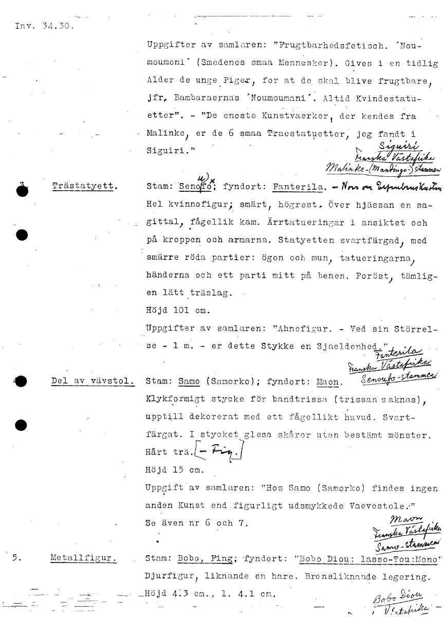 Liv. 34.30. Uppgifter av samlaren: "Frugtbarhedsfetisch. "Non- moumoni" (Smedenes smaa Mennesker). Gives i en tidlig Ålder de unge Pigers for at de skal blive frugtbare, jfr, Bambaraernas "Noumoumani"...