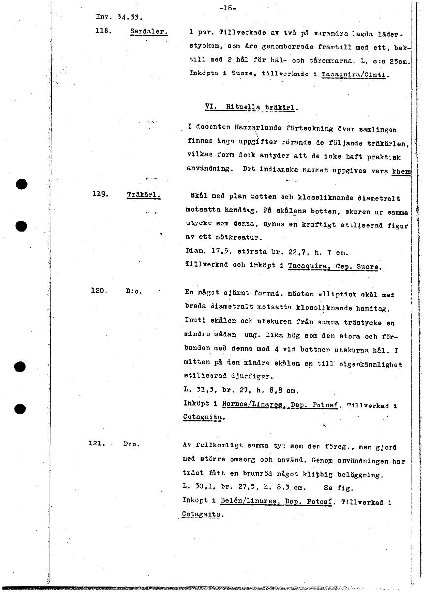 • Inv. 34.33. 118. Sandaler. 1 par. Tillverkade av två på varandra lagda läder- stycken, som äro genomborrade framtill med ett, bak- till med 2 hål för häl- och tåremmarna. L. o:a 25om. Inköpta 1 Sucre,... Visa hela