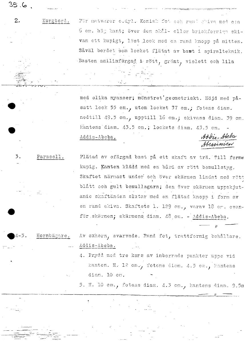 35 , 2. Korgbord. För matvaror o.dyl.- Konisk fo'. nch rar' iva mc c:a cm. hö.-: kant; över den skål- eller brickforn ski- van ett kupigt, löst lock med en rund knopp på mitten. Såväl bordet som locket flätat av bast i spiralteknik. Basten anilinfärgad rött! grönt, violett och lila med olika nyanser; mönstret.geometriskt. Höjd med på- satt lock 55 cm utom locket 37 cm. / • fotens diam. nedtill 49.5 cm.) upptill 16 cm.); skivans diam. 39 cm. kantens diam. 4,3.5 oro.; lockets diam. 43.5 cm. - Addis-Abeba. 3. Parasoll. Flätad av cyrärgad bast på ett skaft av trä:Till forme kupig. Kanten klädd med en bård av rött bomullstyg. Skaftet närmast under och över skärmen lindat med rött blått och gult bomullsgarn; den över skärmen uppskjut- ande skaftänden slutar med en flätad knopp i form av en .rund skiva. Skaftets 1. 129 cm., varav 18 ca. ovan- för skärmen; skäYmens diam. 4F cm. -' Addis-Abeba. Fornbäjare. Av oxhorn) svarvade. Rund fot) trattformig behållare. Addis-Abeba. 4. Prydd mod tre kors av inborr;-de punkter uppe vid kanten. H.. 12 cm.) fotens diam. 4.5 cm.) kantens diam. 10• cm. 5. R. 10 cm. fotens diam. 4.3 cm., kanters diam. 9.501 [ocr]