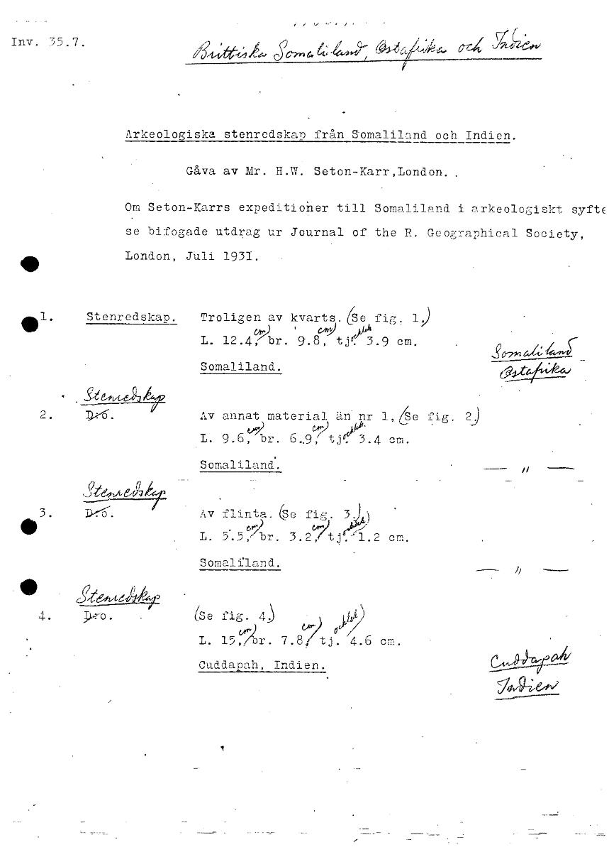 Inv. 35.7. Arkeologiska stenredskap från Somaliland och Indien. Gåva av Mr. H.W. Seton-Karr,London. Om Seton-Karrs expeditioner till Somaliland i arkeologiskt syftE se bifogade utdrag ur Journal of th...