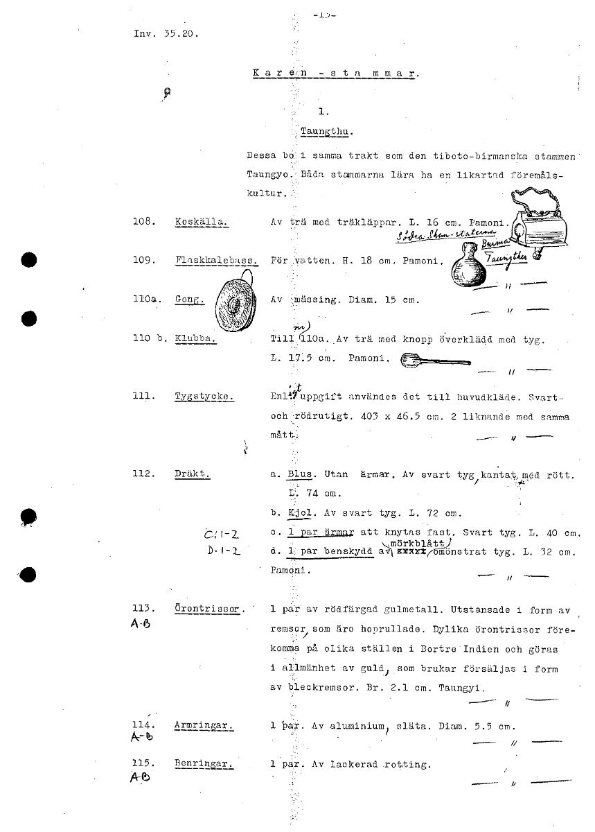 Inv. 35.20. Karen -sta mmar. 1. Taunthu. Dessa ba"i samma trakt som den tibeto-birmanska stammen' Taungyo: Båda stammarna lära ha en likartad föremåls- kultur. 108. Koskälla. Av trä med träkläppar. L....Visa hela