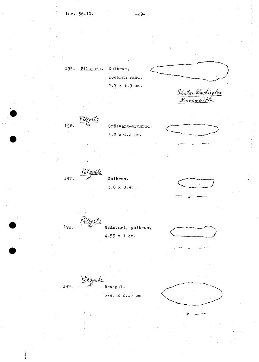 • Inv. 36.10. -29- 195. Pilspets. Gulbrun, rödbrun rand. 7.7 x 1.9 cm. Se4f 04 • 196. Gråsvart-brunröd. 5.2 x 1.2 cm. • Gulbrun. 3.6 x 0.95. 44eA4 01› 198. Gråsvart, gulbrun; 4.55 x 1 cm. 01> 199. Brung... Visa hela