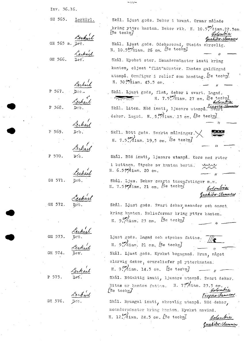 Inv. 36.16. GH 565. Lerkärl. Skål. Ljust gods. Dekor i brunt. Ormar målade kring yttre kanten. Dekor rik. H. ES'e teckn] GH 565 a. p,re. Skål. Ljust gods. °dekorerad/ Utsida skrovlig. 4„,,haLl H. 10.5diam. 26 cm. teckni GH 566. 11:d. Skål. Mycket stor. Meandermönster inuti kring .kanten eljest "flät"mönster. Kanten gulfärgad utanpå. Ormfigur i relief som handtag.be teck.d. H. 3092>diam. 45.5 cm. P 567. Skål. Ljust gods/ flat, dekor i svart. Lagad. H. 7.5:72diam. 27 cm. L3 e tecY P 568. Skål. Liten. Röd inuti ljusare utanpå. .\ar dekor. Lagad. H._5.4iam. 13 Cm. ae teek . P 569. ' Skål. Rött gods. Sva'rta målningar. H. 7.5e:422iam. 19,5 cm, Is e teckd P 570. 3ö0. Skål. Röd inuti ljusare utanpå. Kors med rutor i bottnen. Stycke av kanten borta. 4444 H. 6.5Mj4am. 20 cm. Skål. Ljus. Dekor 'svarta tusenfotingar m.m. H. 7.59s9iam. 21 cm. Se teckn7 .A964( GH 572. 9„:ö. Skål. Ljust gods. Svart dekor meander och annat. kring kanten. Relieformar kring yttre kanten. H. 9,r15'Aam, 23 cm. be tecka A , e GH 573. )),:6. Ljust gods. Lagad och stycken fattas. 121:1 11. m, (:),Aam. 21 cm. be techni k'&444.,e i, GH 574. LL:o". Skål. Ljust gods. Mycket begagnad. Brunt något slarvig dekor) ormreliefer på ytterkanten. / H. 9, r i am. 14.5 cm. ESe tec'rnj - if P 575. Skål. Rödaktig inuti ljusare utanpå. Svart dekor. Bitar ur kanten fattas. H. 7—, 23.5 cm. ,( teek [se GE 576. Skål. Brungul inuti/ skrovlig utanpå. Röd .dekOr/ meandermönster kring kanten. M.ycket använd.. H. ) 12,/diam. 24.5 cm. be teckp1 [ocr]