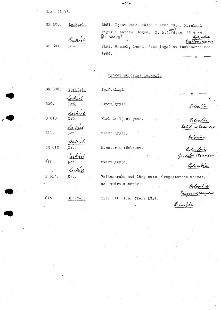 • Inv. 36.16. GH 606. Skål. Ljust gods. Målad i brun färg. Korslagd • t.-9 figur i botten. Lagad.. H. 6.5,/diam. 23.5 cm. ( [se teeknj 6ia, I oCtrote GH 607. ,1)-0. Skål. Gammal) lagad. Även lagad av in... Visa hela