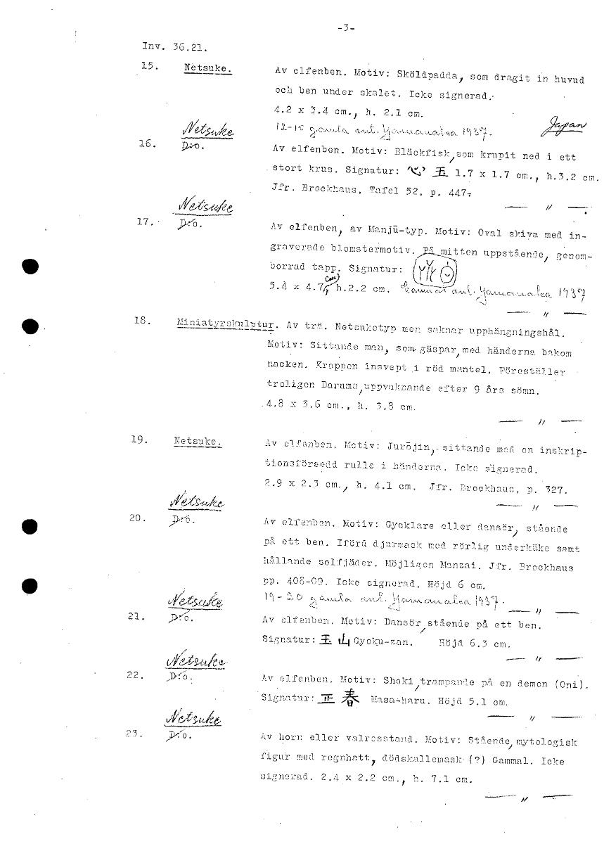 Inv. 36.21. 15. Netsuke. Av elfenben. Motiv: Sköldpadda, som dragit in huvud och ben under skalet. Icke signerad; 3.4 cm., h. 2.1 cm. 16. 5:07 Av elfenben. Motiv: Bläckfisk/som krupit ned. i ett .stort krus. Signatur: T, 1.7 x 1.7 cm., h.3.2 cm. Jfr. Drockhnus, Tafel 52, p. 447. /644k •. 17.- Av elfenben/ av Manj71-typ. Motiv: Oval skiva med, in- graverade blomstermotiv. genom- -, amitten uppstående, borrad tapp. Signatur: 18. Miniatyrekulptur. Av trä. Neteuketyp men saknar unphängningshål. Motiv: Sittande man, soA,g52parlmed. händerna bakom nacken. Kroppen insvept i röd mantel. Pöreställer troligen Darumar uppvaknande efter 9 års sömn. .4.8 x 3.6 cm., h. 3.8 cm. 19. Netsuke_._ Av elfenben_ Motiv: JurTijin).sittande inekrip- tionsförsedd rulle Icke s'ignercd. 2.9 x 2.3 h. 4.1 cm. Jfr. Brockhaus, P. 327. Av elfenben.. Motiv: Gycklare eller dansör2 stående På ett ben. Iförd djurmask med rörlig underkäke samt hållande solfWer. Möjligen Menzni. Jfr. Brockhaus 408-09. Icke signerad. Höjd de,eke, -4 Av elfenben. Motiv: Dansör stående nå ett ben. Signatur: d4Gyoku-zan. Höjd 6.3 cm. 644/aiAe- Av elfenben. Motiv: Shoki trampan le på en demon (On), i. Signatur: Masa.haru. Höjd 5.1 cm. Av horn eller valrosstand. Motiv: Stående mytologisk figur med regnhatt, dödskallemask- (?) Gammal. cm., h. 7.1 cm. [ocr]