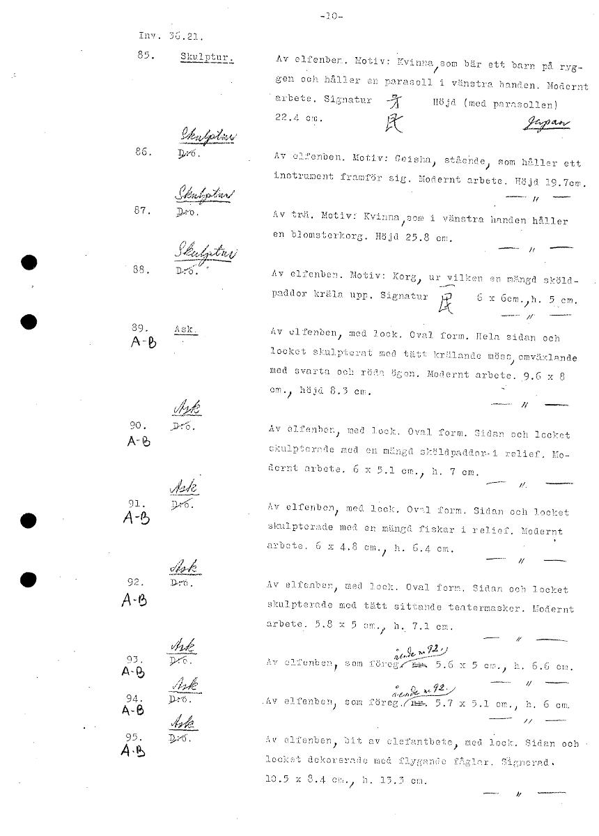 85. Skulptur. Av elfenben_ Motiv: Kvinna/som bär ett barn rå ryg- P.en och håller en rarasoll i vänstra banden. Modernt arbete. Signatur 711 Höjd (med. parasollen) -;' 86. Av elfenben. Motiv: Geisha s...Visa hela