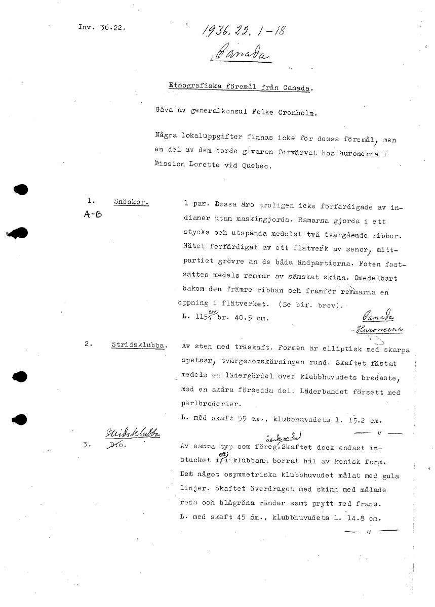 Inv. 36.22. /93‘, 2„?, - /g Etnografiska föremål från Canada. Gåva av generalkonsul Folke Cronholm. Några lokaluppgifter finnas icke för dessa föremål) men en del av dem torde givaren förvärvat hos huronerna i Mission Lorette vid Quebec. 1. Snöskor. 1 par. Dessa äro troligen icke förfärdigade av in- A-6 dianor utan maskingjorda. Ramarna gjorda i ett stycke och utspända medelst två tvärgående ribbo...