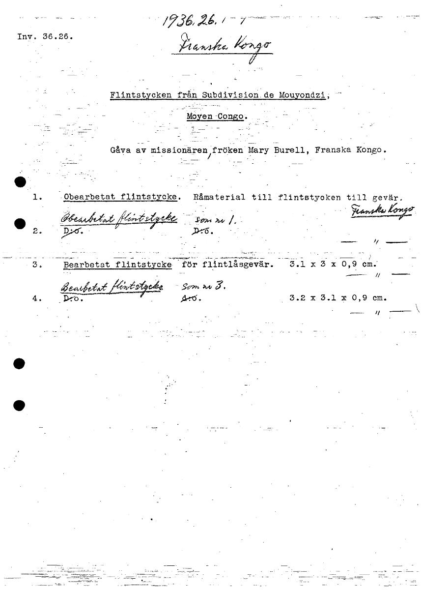 /736, 0.-2.4, - Inv. 36.26. )44,1t/ Flintstycken från Subdivision.de Mouyondzi; Moyen -Congo • Gåva av missionären fröken Mary Burell, Franska Kongo. 1. Obearbetat flintstycke. Råmaterial till flintstycken till gevär. _0444,44,t/kg„e2-e 2. 3. Bearbetat flintstycke för flintlåsgevär. 3.1 x x 0, 9 cm.- teut.<441 tik - ? 3. 4. Pkro. Art-6. 3.2 x 3.1 x 0,9 cm. • [ocr]