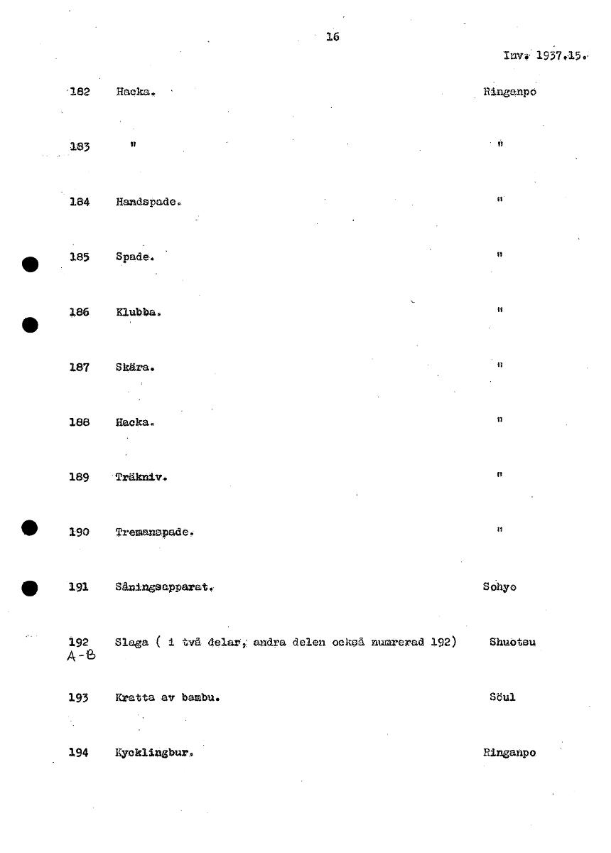 16 Lav:- 1937,15,, 182 H c llingarIP 183 184 Handepade. 185 Spade, 186 Klubba 187 Skära 188 Hacka, 189 Trifitniv, tt 411 190 Tremanapade, • 191 Sdningeapparat, sohyo 192 Slaga ( i två delar,' andra delen också noterad 192) Shuoten 193 Kratta av bamba. Sd u 1 194 Kyok1ingbar, RItganpo [ocr]