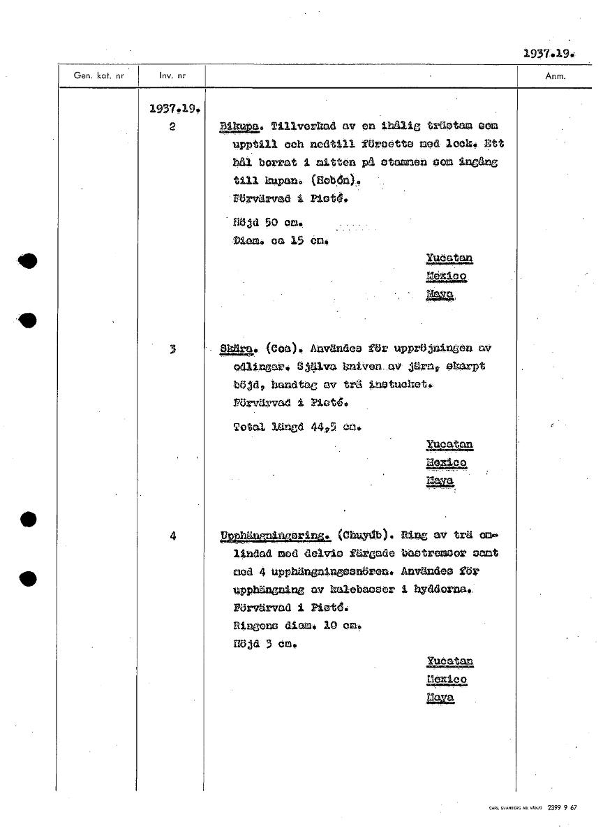 1937.19. 1937.1 2 Bil. uma. Tillver av en ihålig träotam eon upptill och nedtill föreetto med lookö Ett hål borrat 1 mitten På otanmen oon inurane till kupan. (g0114n).. Förvärvad 1 Fimtdö Röjd 50 cm. Miau ca 15 dm. skära. (Coa). Användeo för uppröjningen ev odlingar Själva kniven.av jämt; ek et böjd, handtag av trä inotu het Pörvärvad i Piotd. Total längd 4495 C. 4 2XEDMeWmuu2au (CbuYdb)* Ring av trä on. lindad mod delnio garoado hamtremoor oamt med 4 upphängningoonörene Använde° för upphängning av kaIebameer i hyddorna., Förvärvad 1 Plotd. Ringen.° diam. 10 om. Röjd 3 cm. Yueatan tlexleo 1.1241 [ocr]Stäng