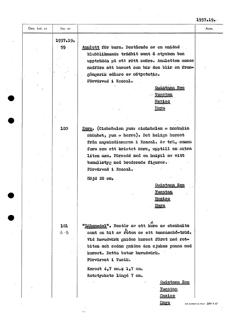 1937.19. 1937.19. 99 Amulett för barn. Bestående av en onidad klubbliknande trädbit °amt 6 stycken ben uppträdda på ett rött snöre. Amuletten anse° medföra att barnet mom bär den blir en fraM- gångsrik odlare av sötpotatio. Förvärvad i Xcacalo quintanall o -.-YUcatan Mexico L.„2.929. 100 Kors (Cichohelom yum: oichohelem = maskulin skönhet, yum = herre). Det heliga korset från mayaindianerna i Xcacal, Av trä, samma form som ett kristet kors, upptill en extra liten arm. Försedd med en huipil av vitt bomullstyg med broderade figurer, Förvärvad i Xcacalo Höjd 28 cm. Quintana Rom Yucatan Mexico 101 Läkemedel. Rostar av ett kAors av ebenholts A -5 samt au bit av roten av ett tancaschd..träda Vid huvudvärk gnideo korset föret med rot. biten och sedan enides den sjukes panna med korset. Detta botar huvudvärk. Förvärvat i Tuoik. Korodt 4,7 cmog, 1,7 em. Rotetyckete•längd 7 ca. Quintana fao Yucatan Mexico at% [ocr]