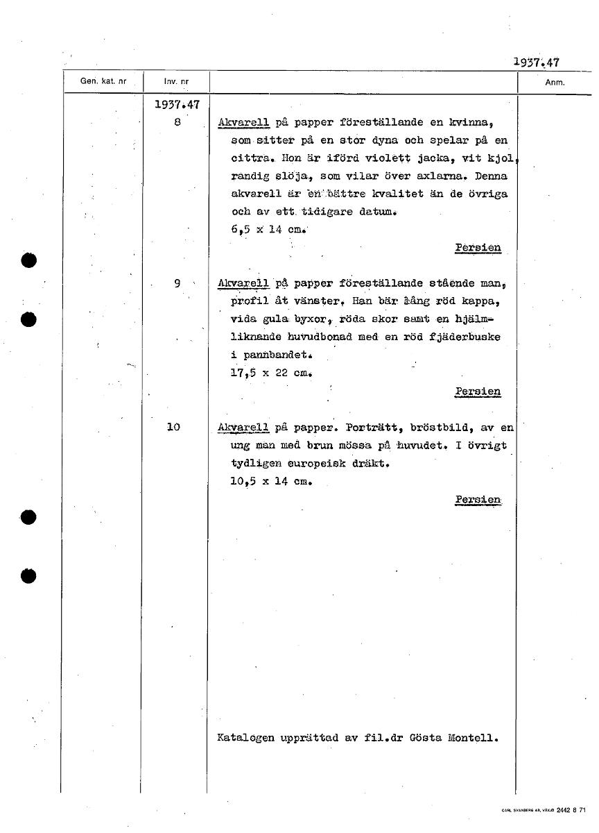1937.47 1937.47 8 • Akvarell på papper föreställande en kvinna, som sitter på en stor dyna och spelar på en cittra. Hon är iförd violett jacka, vit kjol randig slöja, som vilar över axlarna. Denna akvarell är -ebättre kvalitet än de övriga och av ett tidigare datum. 695 x 14 cm. Persien 9 Akvarell på papper föreställande stående man, Profil åt vänster, Han bär lång röd kappa, vida gula byxor, röda skor samt en hjälm- liknande huvudbonad med en röd fjäderbuske i pannbandet. 17,5 x 22 cm. Persien Akvarell på papper. Porträtt, bröstbild, av en ung man med brun mössa på huvudet. 1 övrigt tydligen europeisk dräkt. 10,5 x 14 cm. Persien. Katalogen upprättad av fil.dr Gösta Montell. [ocr]