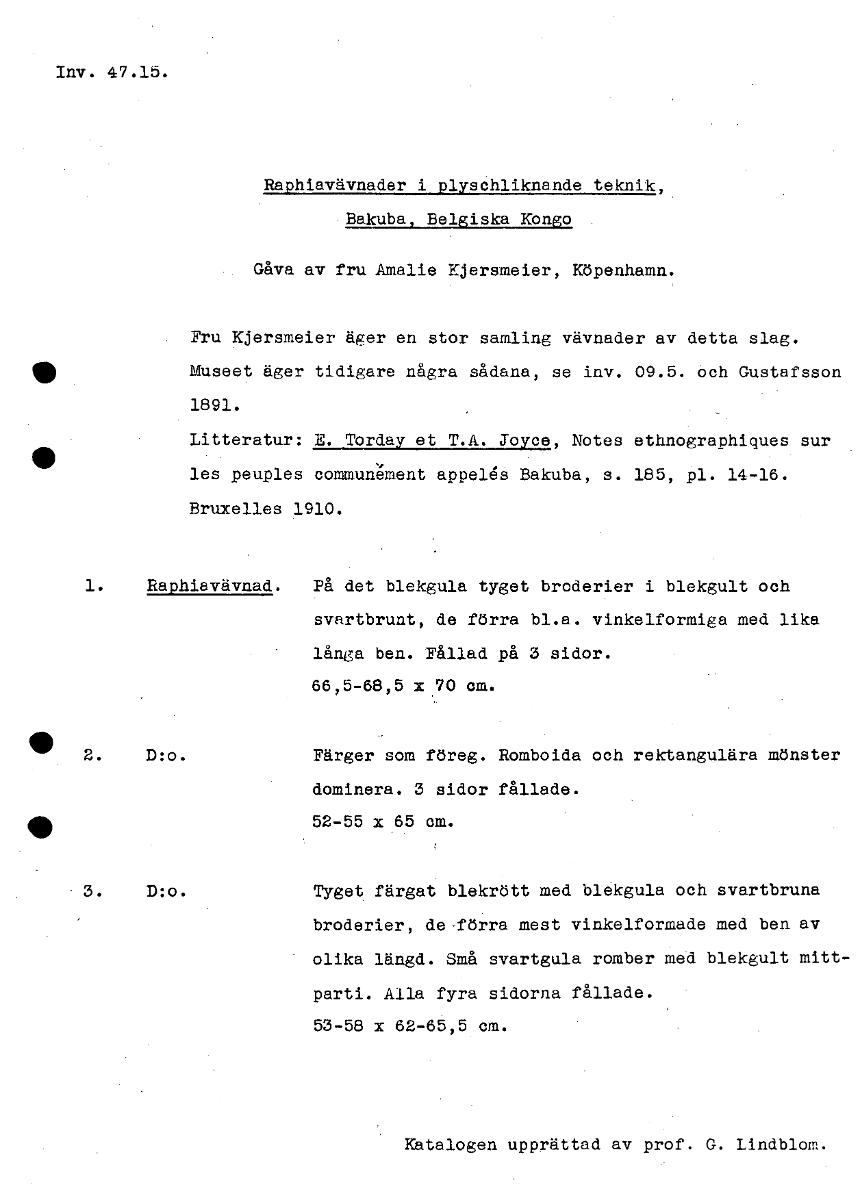 Inv. 47.15. Raphiavävnader i plyschliknande teknik, Bakuba, Belgiska Kongo Gåva av fru Amalie Kjersmeier, Köpenhamn. Fru Kjersmeier äger en stor samling vävnader av detta slag. Museet äger tidigare några sådana, se inv. 09.5. och Gustafsson 1891. Litteratur: E. Torday et T.A. Joyce, Notes ethnographiques sur les peuples communement appeles Bakuba, s. 185, pl. 14-16. Bruxelles 1910. 1. Raphievävnad. På det blekgula tyget broderier i blekgult och svartbrunt, de förra bl.a. vinkelformiga med lika långa ben. Fållad på 3 sidor. 66 5-68,5 x 70 cm. 2. D:o. Färger som föreg. Romboida och rektangulära mönster dominera. 3 sidor fållade. 52-55 x 65 cm. • 3. D:o. Tyget färgat blekrött med blekgula och svartbruna broderier, de-förra mest vinkelformade med ben av olika längd. Små svartgula romber med blekgult mitt- parti. Alla fyra sidorna fållade. 53-58 x 62-65,5 cm. Katalogen upprättad av prof. G. Lindblom. [ocr]