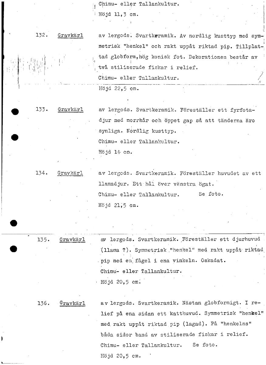 • Chimu- eller Tallankultur. Höjd 11,3 cm. 132. Gravkärl av lergods: Svartkeramik. Av nordlig kusttyp med sym- metrisk "henkel" och rakt uppåt riktad pip. Tillplat- tad globform9hög [ konisk fot. Dekora... Visa hela