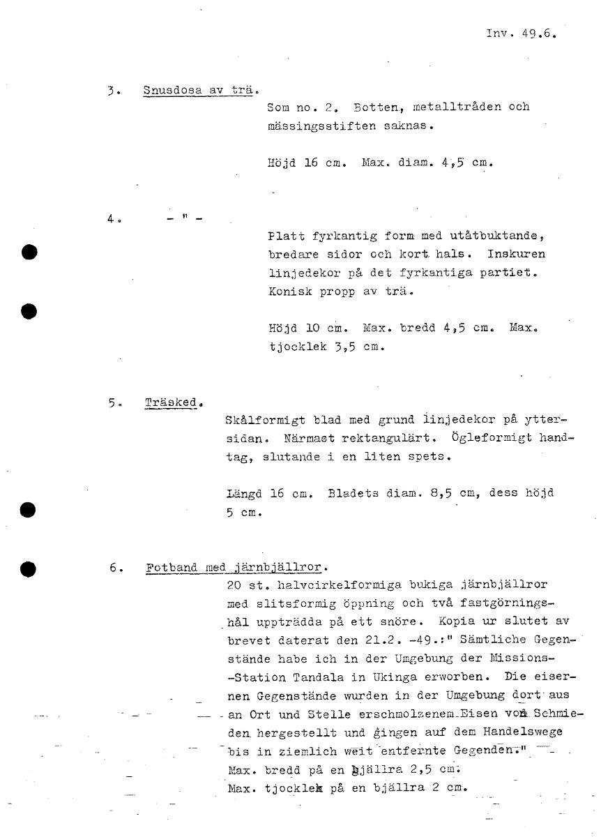 Inv. 49.6. 3. Snusdosa av trä. Som no. 2. Botten., metalltråden och mässingsstiften saknas. Höjd 16 cm. Max. diam. 4,5 cm. Platt fyrkantig form. med utåtbuktande, bredare sidor och kort hals. Inskuren linjedekor på det fyrkantiga partiet. Konisk propp av trä. • Höjd 10 cm. Max. bredd 4,5 cm. Max. tjocklek 3,5 cm. 5, Träsked, Skålformigt blad med grund linjedekor på ytter- sidan. Närmast rektangulärt. Ögleformigt hand- tag, slutande i en liten spets. Längd 16 cm. Bladets diam. 8,5 cm, dess höjd 110 5 cm. • 6. Fotband med järnbjällror. 20 st. halvcirkelformiga bukiga järnbjällror med slitsformig öppning och två fastgörnings- hål uppträdda på ett snöre. Kopia ur slutet av brevet daterat den 21.2. 49.:" Sämtliche Gegen- stände habe ich in der Umgebung der Missions- -Station Tandala in Ukinga erworben. Die eiser- nen Gegenstände wurden in der Umgebung dort.aus -an Ort und Stelle erschmolzenem_Disen vork.Schmie- den. hergestellt und gingen auf dem Handelswege bis in ziemlich wit entfernte Gegenden-.-" Max. bredd på en Bjällra 2,5 cm; Max. tjocklek på en bjällra 2 cm. [ocr]