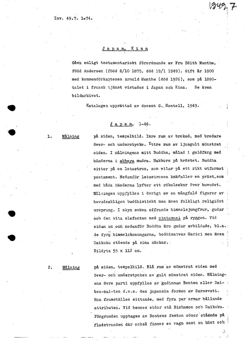I/'t.?". Inv. 49.7. 1.74. Japan, Kina Gåva enligt testamentariskt förordnande av Fru Edith Munthe, född Andersen (född 8/10 1875, död 19/1 1949). Gift år 1900 med kommendörkaptenen Arnold Munthe (död ...