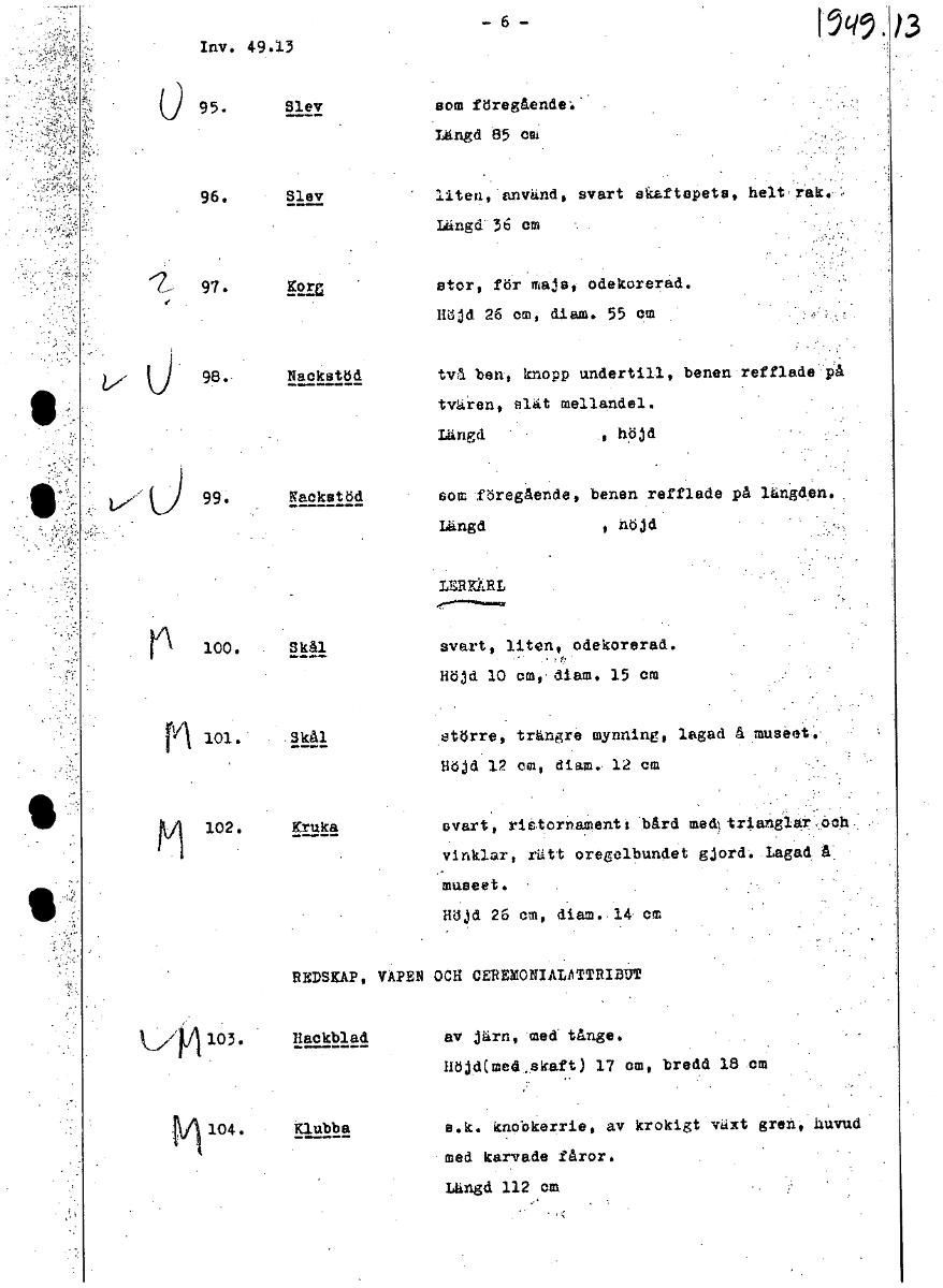 13 Inv. 49.13 95. Slev som föregående. Längd 85 cm 96. Slev liten, använd, svart skaftspets, helt rall. Längd 36 em 97. Kora stor, för Majsf °dekorerad. Höjd 26 om, diam. 55 cm 98. Nackstöd två knopp ...
