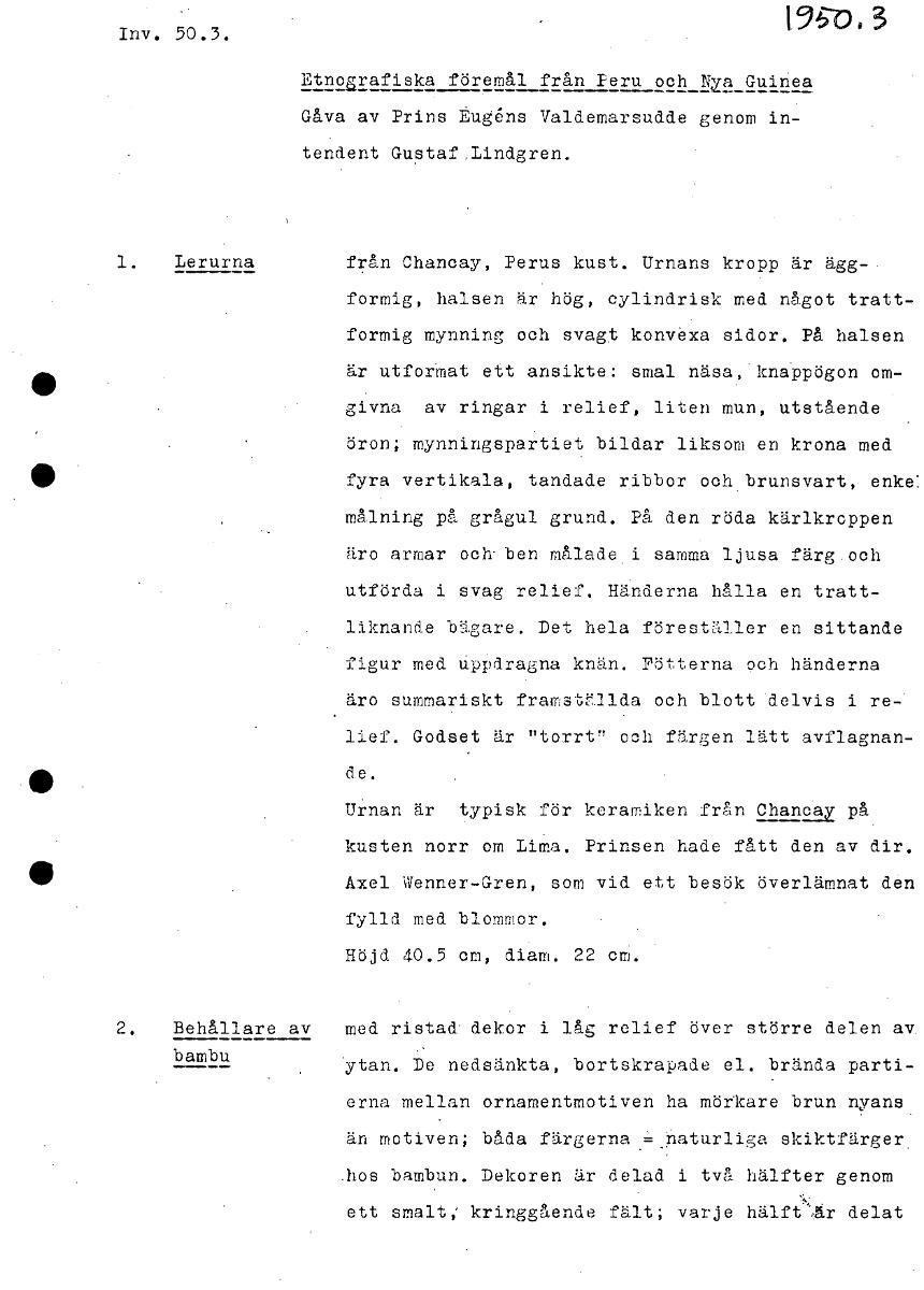 I %?)3 Inv. 50.3. Etnografiska föremål från Feru och Nat Guinea Gåva av Prins Eugens Valdemarsudde genom in- tendent Gustaf, Lindgren. 1. Lerurna från Chancay, Perus kust. Urnans kropp är äggformig, ...
