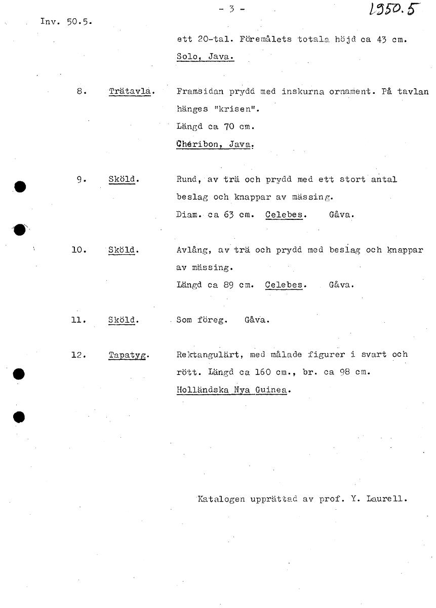 —3— L55-0.6- Inv. 50.5. ett 20-tal. Föremålets totala höjd ca 43 cm. Solo, Java. 8. -Trätavla. Framåidan prydd med inskurna ornaffient. På tavlan hänges "krisen". • Längd ca 70 cm. CIAribon, Java. 9. Sköld. Rund, av trä och prydd med ett stort antal beslag och knappar av mässing. Diam. ca 63 cm. Celebes. Gåva. 10. Sköld. Avlång, av trä och prydd med beslag och knappar av mässing. Längd ca 89 cm. Celebes. Gåva. 11. Sköld. Som föreg. Gåva. 12. Tapatyg. Rektangulärt, med målade figurer i svart och rött. Längd ca 160 cm., br. ca 98 cm. Holländska Nya Guinea. 'Katalogen upprättad av prof. Y. Laurell. [ocr]Stäng