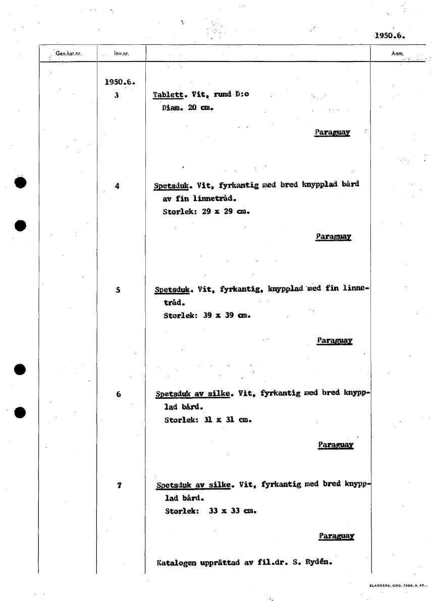 1950.6. Tablett. Vit, rund D:o Diam. 20 cm. Paraguay 9 4 Spetsduk. Vit, fyrkantig med bred knypplad bård av fin linneträd. Storlek: 29 x 29 cm. • Paraguay 5 Spetsduk. Vit, fyrkantig, knypplad med fin linne- tråd. Storlek: 39 x 39 cm. Paraguay 6 Spetsduk av silke. Vit, fyrkantig med bred knypp- lad bård. Storlek: 31 x 31 cm. Paraftualr 7 Spetsduk av silke. Vit, fyrkantig med bred knypp- lad bård. Storlek: 33 x 33 cm. Parantas, Katalogen upprättad av fil.dr. S. Ryddn. [ocr]