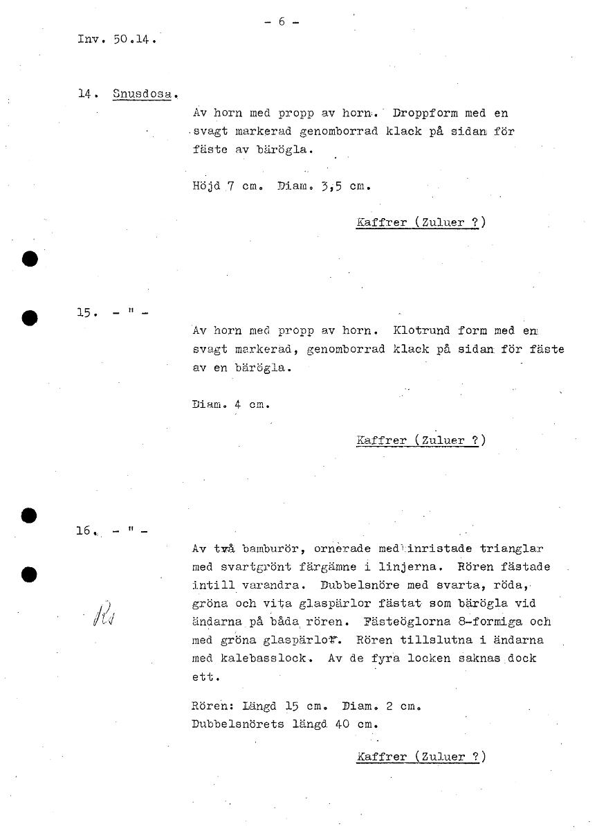 Inv. 50.14. 14. Snusdosa. Av horn med propp av horn. Droppform med en •svagt markerad genomborrad klack på sidan för fäste av bärögla. Höjd 7 cm. Diam. 3,5 cm. Kaffrer (Zuluer ?) 15. " Av horn med pro...