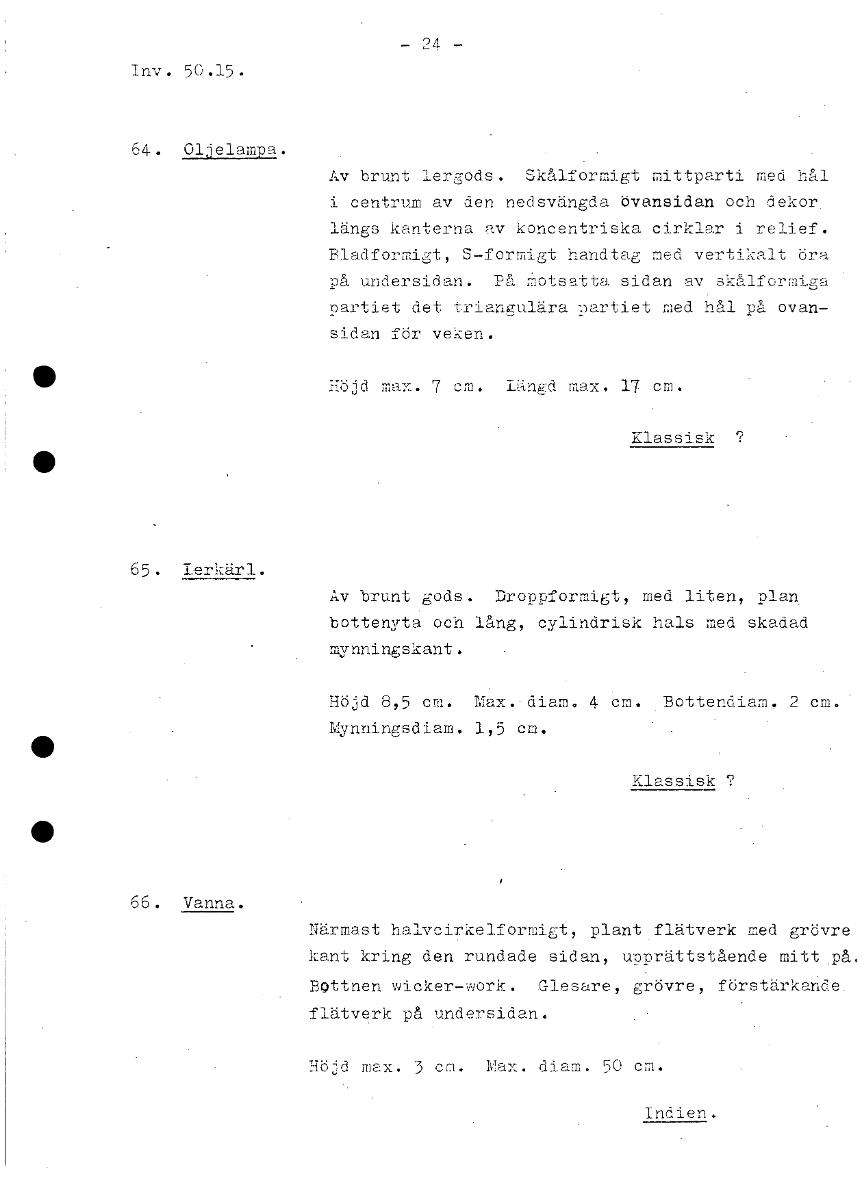 - 2^ - Inv. 50.15. 64. Oljelampa. Av brunt lergods. Skålformigt mittparti med hål i centrum av den. nedsvängda övansidan och dekor. längs kanterna av koncentriska cirklar i relief. Bladformigt, S-formigt handtag med vertikalt öra på undersidan. På Motsatta sidan av skålformiga nartiet det triangulära partiet med hål på ovan- sidan för veken. Höjd max. 7 cm. Längd max. 17 cm. Klassisk c? 65. Ierkär . Av brunt gods. Droppformigt, med liten, plan. bottenyta och lång, cylindrisk hals med skadad mynningskant. Höjd 8,5 cm. friax. diam. 4 cm. Bottendian. 2 cm. Mynningsdiam. 1,5 cm. Klassisk c? 66. Vanna. Närmast halvcirkelformigt, plant flätverk med grövre kant kring den rundade sidan, upprättstående mittpå, Bottnen vicker-work. Glesare, grövre, förstärkaride. flätverk på undersidan. Höjd max. 3 cm. Max. diam. 50 cm. Indien. [ocr]