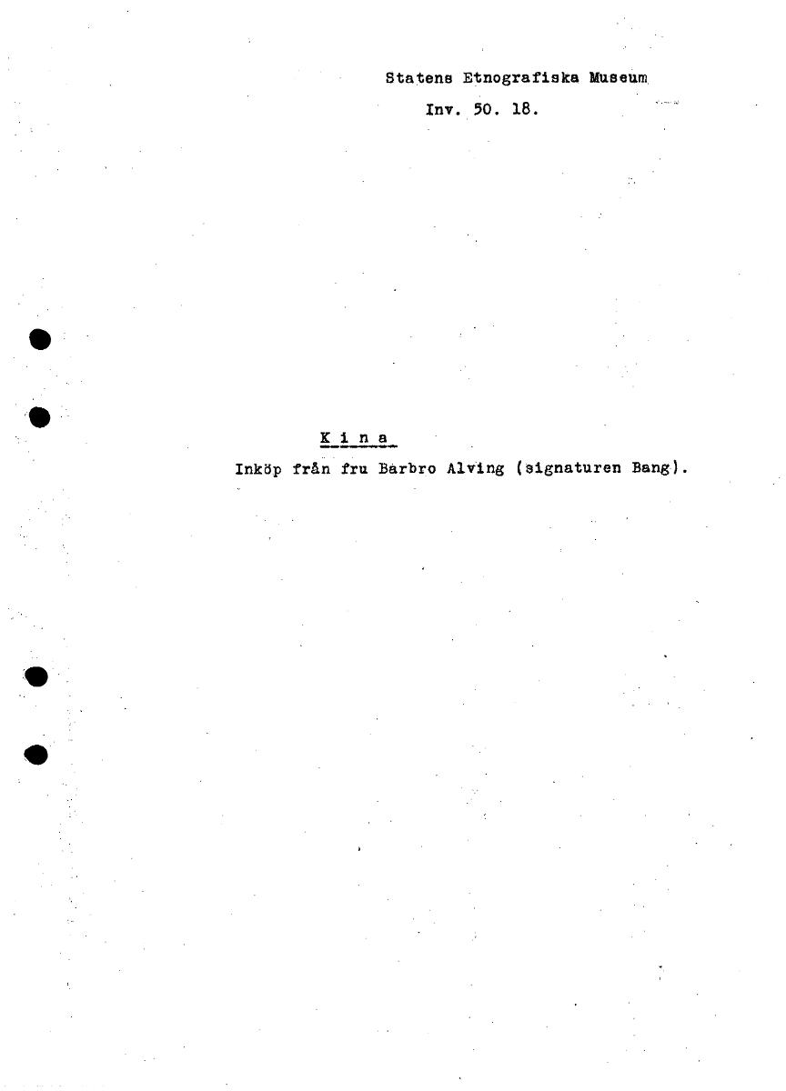 • Statens Etnografiska Museum Inv. 50. 18. Kina Inköp från fru Barbro A1ving (signaturen Bang). [ocr]