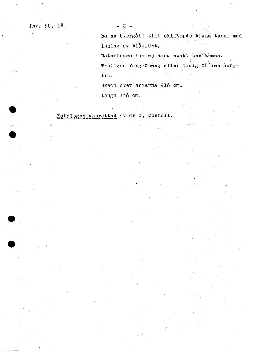 • Inv. 50. 18. - 2 - ha nu övergått till skiftande bruna toner med inslag av blågrönt. Dateringen kan ej ännu exakt bestämmas. Troligen Yung Che'ng eller tidig Oh"ien Lung- tid. Bredd över ärmarna 218 c... Visa hela