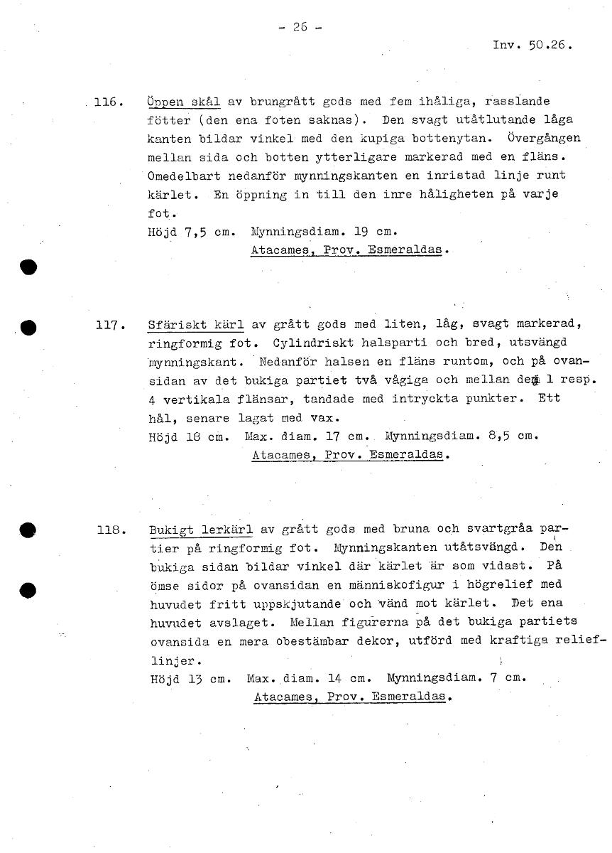 - 26 - Inv. 50.26. . 116. Öppen skål av brungrått gods med fem ihåliga, rasslande fötter (den ena foten saknas). Den svagt utåtlutande låga kanten bildar vinkel med den kupiga bottenytan. Övergången m...