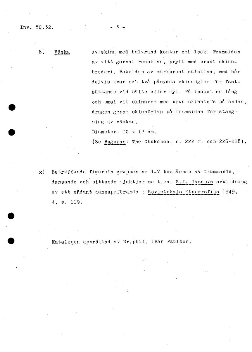 Inv. 50.32. - 3 Väska av:skinn med halvrund kontur och lock. Framsidan av vitt garvat renskinn, prytt med brunt skinn- broderi. Baksidan av mörkbrunt sälskinn, med hår delvis kvar och två påsydda skinnöglo'r för fast- sättande vid bälte eller dyl. På locket en lång och smal vit skinnrem med brun skinntofs på ändan, • dragen genom skinnöglan på framsidan för stäng- ning av väskan. • Diameter: 10 x 12 cm. (Se Bov)ras: The Chukchee, s. 222 f. och 226-228). x) Beträffande figurala gruppen nr 1-7 bestående av trummande, dansande och sittande tjuktjer se t.ex. S.I. Ivanovs avbildning av ett sådant dansuppförande i Sovjetskata Etnouafija 1949, 4, s. 119. • • Katalogen upprättad av Dr.phil. Ivar Paulson. [ocr]