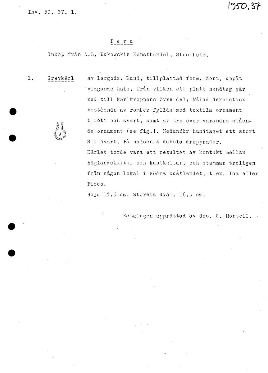 I95O,3? Inv. 50. 37. 1. Peru Inköp från A.B. Bu1:owskis Konsthandel, Stockholm. 1. Gravkärl av lergods. Rund,-tillplattad form. Kort, uppåt vidgande hals, från vilken ett platt handtag går ned till kä...