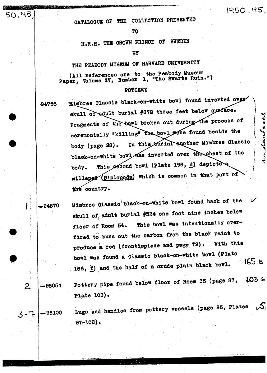 CATALOGUE OF THE COLLECTION PRESENTED TO H.R.H. THE CROWN PRINCE OF SWEDEN BY THE PEABODY MUSEUM OF HARVARD UNIVERSITY (All referenoes are to the Peabody Museum Paper, Völume XV, Nurober 1, "The Swart...