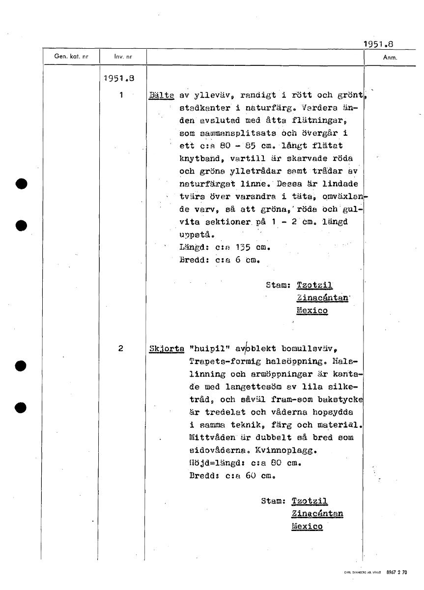 195103 1951.8 1 Bälte av yllevävs randigt i rött och grönt stadkanter i naturfärg. Vardera än- den avslutad med åtta flätningar som sammansplitsats och övergår i ett c:a 80 - 85 cm. långt flätat knytband, vartill är skarvade röda och gröna ylletrådar samt trådar av naturfärgat linne. Dessa är lindade tvärs över varandra i täta p omväxlan de varvp så att grönap'röda och gul- vita sektioner, på 1 - 2 cal. längd uppstå. Längd: c:a 135 cm. Bredd: c:a 6 cm. Stam: Tzotzil Zinacåntan' Mexico 2 Skjorta "huipil" a3141ekt bomullsväv, Trapets-formig halsöppning. Hals- linning och armöppningar är kanta- de med langettesöm av lila silke- tråd, och såväl fram-som bakstycke är tredelat och våderna hopsydda i samma teknik9 färg och material. Mittvådan är dubbelt så bred som sidovåderna. Kvinnoplagg. flöjd=längd: c:a 80 cm. Bredd: c:a 60 cm. Stam: Tzotzil Zinacåntan Mexico [ocr]Stäng