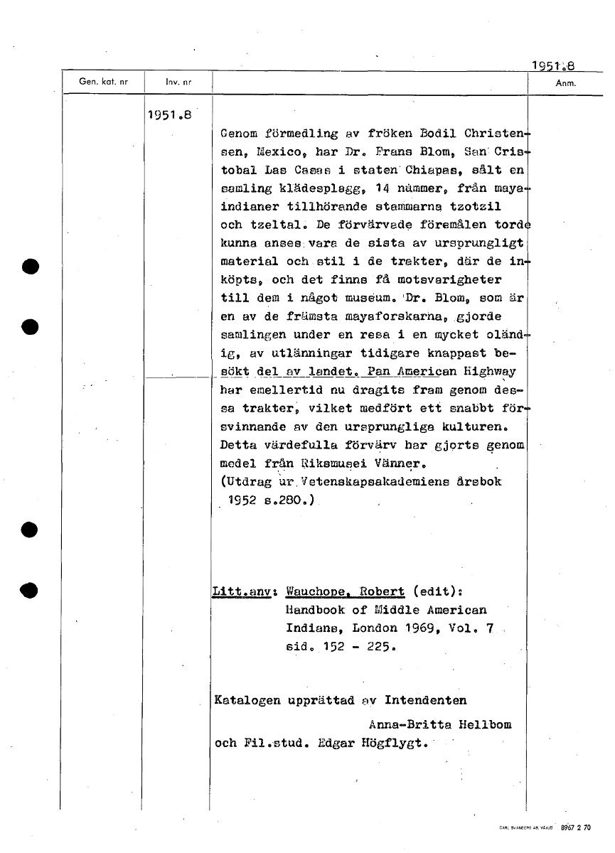 1951`.8 1951 .8 Genom förmedling av fröken Bodil Christen sen, Mexico, har Dr. Frans Blom, San Cris tobal Las Casas i staten Chiapas, sålt en samling klädesplagg, 14 mimer, från maye indianer tillhöra...