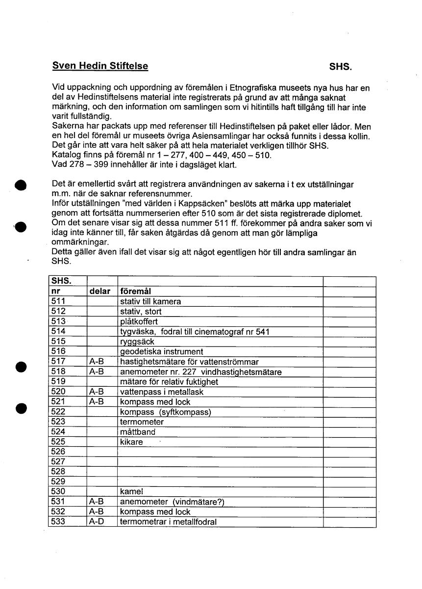 Sven Hedin Stiftelse SHS. Vid uppackning och uppordning av föremålen i Etnografiska museets nya hus har en del av Hedinstiftelsens material inte registrerats på grund av att många saknat märkning, och den information om samlingen som vi hitintills haft tillgång till har inte varit fullständig. Sakerna har packats upp med referenser till Hedinstiftelsen på paket eller lådor. Men en hel del föremål ur museets övriga Asiensamlingar har också funnits i dessa kollin. Det går inte att vara helt säker på att hela materialet verkligen tillhör SHS. Katalog finns på föremål nr 1 — 277, 400 — 449, 450 — 510. Vad 278 — 399 innehåller är inte i dagsläget klart. Det är emellertid svårt att registrera användningen av sakerna i t ex utställningar m.m. när de saknar referensnummer. Inför utställningen "med världen i Kappsäcken" beslöts att märka upp materialet genom att fortsätta nummerserien efter 510 som är det sista registrerade diplomet. Om det senare visar sig att dessa nummer 511 ff. förekommer på andra saker som vi idag inte känner till, får saken åtgärdas då genom att man gör lämpliga ommärkningar. Detta gäller även ifall det visar sig att något egentligen hör till andra samlingar än SHS. SHS. nr delar föremål 511 stativ till kamera 512 stativ, stort 513 plåtkoffert 514 tygväska, fodral till cinematograf nr 541 515 ryggsäck 516 geodetiska instrument 517 A-B hastighetsmätare för vattenströmmar 518 A-B anemometer nr. 227 vindhastighetsmätare 519 mätare för relativ fuktighet 520 A-B vattenpass i metallask 521 A-B kompass med lock 522 kompass (syftkompass) 523 termometer 524 måttband 525 kikare 526 527 528 529 530 kamel 531 A-B anemometer (vindmätare?) 532 A-B kompass med lock 533 A-D termometrar i metallfodral [ocr]Stäng