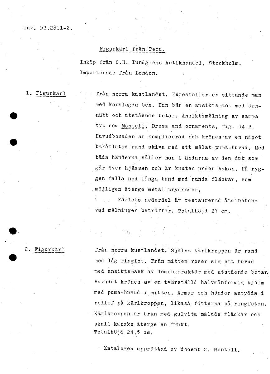 Inv. 52.28.1-2. Figurkärl från Peru. Inköp från C.H. Lundgrens Antikhandel, Stockholm. Importerade från London. 1. Figurkärl från norra kustlandet. Fbreställer en sittande man med korslagda ben. Han bär en ansiktsmask med örn- näbb och utstående betar. Ansiktsmålning av samma typ som Montell, Dress and ornaments, fig. 34 D. Huvudbonaden är komplicerad och- krönes.av en något bakåtlutad rund skiva med ett målat. puma-huvud. Med båda händernajiåller han' i ändarna av den duk som går över hjässan och är knuten under hakan. På ryg- gen falla ned långa band med rundafläckar, som möjligen återge metallprYdnader. Kärletå nederdel är restaurerad åtminStOne vad målningen beträffar, Totalhöjd 27 cm, 2. Figurkärl från norra kustlandet: Själva kärlkroppen är rund med låg ringfot. Från mitten reser sig ett huvud med ansiktsmask hv demonkaraktär med utstående betan Huvudet krönes av en tvärställd halvmånformig hjälm med puma.-huvud i mitten. Armar och händer antydda i relief på kärlkropPrn, likaså fötterna på ringfoten. Kärlkroppen är brun med gulvita målade fläckar och skall kanske återge en frukt. Totalhöjd 24,5 cm. Katalogen upprättad av docent G. Montell. [ocr]