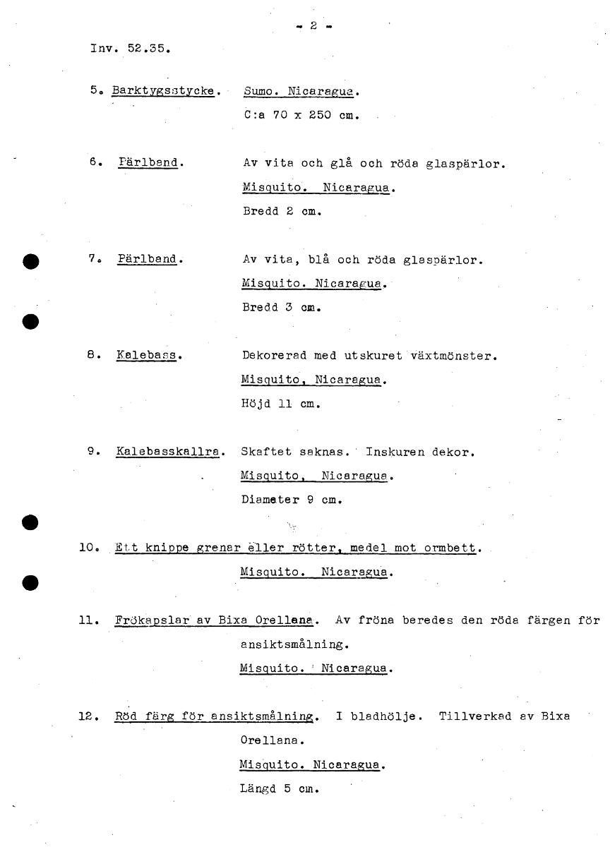 Inv. 52.35. 5. Barktygsstycke. Sumo. Nicaragua. C:a 70 x 250 cm. 6. Pärlband. Av vita och glå och röda glaspärlor. Misquito. Nicaragua. Bredd 2 cm. • 7. Pärlband. Av vita, blå och röda glaspärlor. Misquito. Nicaragua. Bredd 3 cm. 8. Kalebass. Dekorerad med utskuret växtmönster. Misquito, Nicaragua. Höjd 1I cm. 9. Kalebasskallra. Skaftet saknas. Inskuren dekor. Misquito, Nicaragua. Diameter 9 cm. • 10. Ett knippe grenar eller rötter, medel mot ormbett. Misquito. Nicaragua. • 11. Frökapslar av Bixa Orellena. Av fröna beredes den röda färgen för ansiktsmålning. Misquito. ' Nicaragua. 12. R6d färg för ansiktsmålning. I bladhölje. Tillverkad av Bixa Orellana. Misquito. Nicaragua. Längd 5 cm. [ocr]Stäng