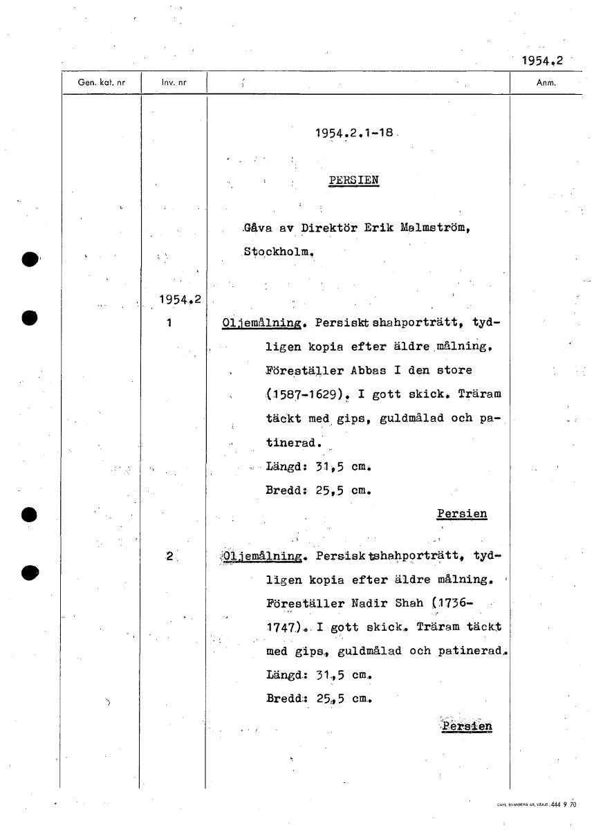 1954.2 - 1954.2.1-18 PERSIEN „Gåva av Direktör Erik Malmström, .Stockholm. 1954.2 • Oljemålning. Persisktshahporträtt, tyd- ligen kopia efter äldre målning, Föreställer Abbas I den store (1587-1629). ...