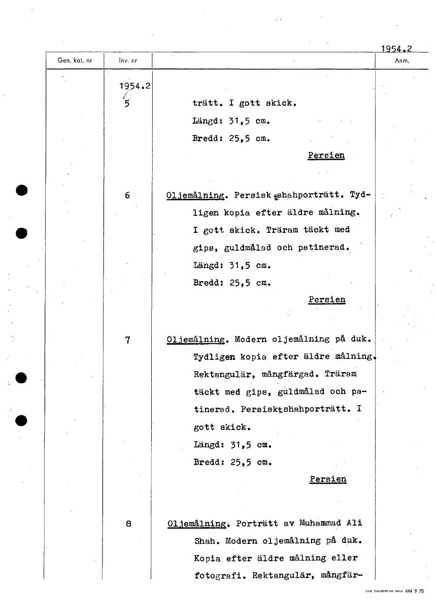 • 1954.2 1954.2 5 trätt. I gott skick. Längd: 31,5 cm. Bredd: 25,5 cm. Persien • 6 Oljemålning. Persisktshahporträtt. Tyd- ligen kopia efter äldre målning. I gott skick. Träram täckt med gips, guldmålad... Visa hela